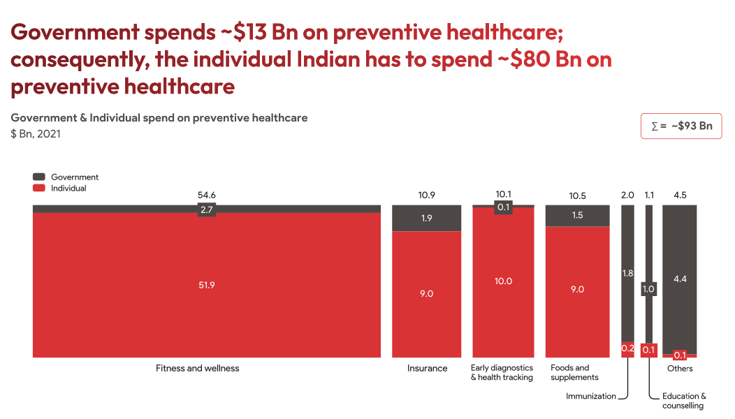 Healthcare in India traditionally means “Curative” Healthcare (diagnosis & treatment). Curative healthcare spending constituted more than 64% of the total spending on healthcare in 2021 (private + government). Yet curative healthcare in India suffers from a highly strained infrastructure, and poor quality of healthcare and further worsened by limited affordability.